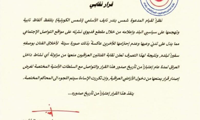 قررت نقابة الفنانين العراقيين، السبت، منع الفنانة شمس الكويتية من مزاولة العمل الفني داخل العراق لمدة سنة كاملة.
