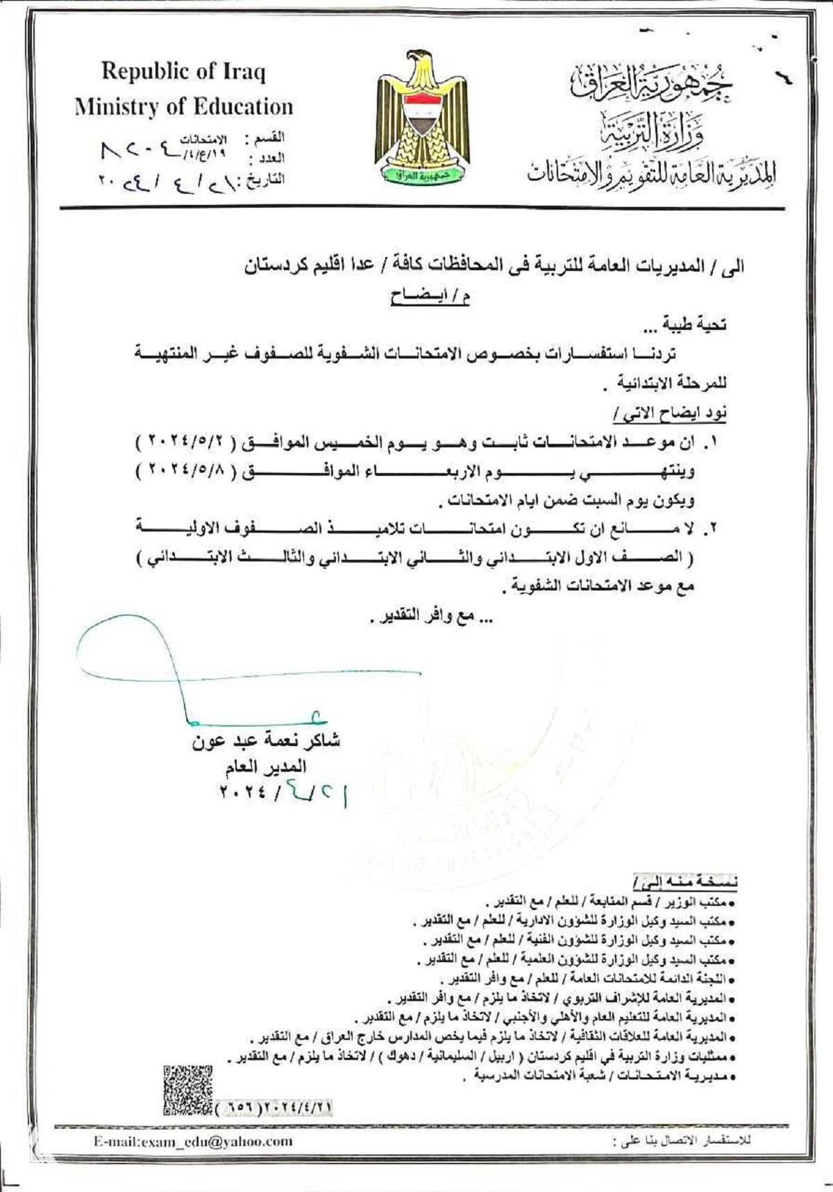وقالت الوزارة في بيان تلقته منصة خبر: إن “المديرية العامة للتقويم والامتحانات في وزارة التربية حددت موعد الامتحانات النهائية للمرحلة الابتدائية/ الصفوف غير المنتهية  يوم الخميس   الموافق (2024/5/2) ولغاية يوم الأربعاء (2024/5/8)”. وأضافت أن “يوم السبت يكون ضمن أيام الامتحانات، مع إمكانية إجراء الامتحانات للصفوف الأولية ( الأول والثاني والثالث الابتدائي ) مع موعد الامتحانات الشفوية”.