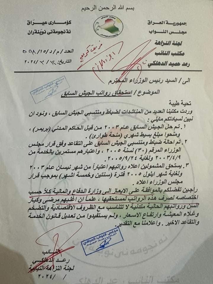 وافق رئيس مجلس الوزراء محمد شياع السوداني على صرف رواتب ضباط ومنتسبي الجيش العراقي السابق. وأشارت وثيقة صادرة من لجنة النزاهة / مكتب النائب رعد الدهلكي بتاريخ (12 آذار 2024)، وحصلت منصة خبر، على نسخة منها، إلى ” استحصال موافقة رئيس الوزراء بالايعاز لوزارتي الدفاع والمالية على صرف رواتب ضباط ومنتسبي الجيش العراقي السابق للفترة (من 2003/4/9 ولغاية 2005/9/24 ) بما يعادل سنتين وخمسة اشهر ، كونهم احيلوا على التقاعد بموجب قرار مجلس الوزراء المرقم ( 30 ) لعام 2005 واعتبارهم مستمرين للفترة المذكوره انفا”.