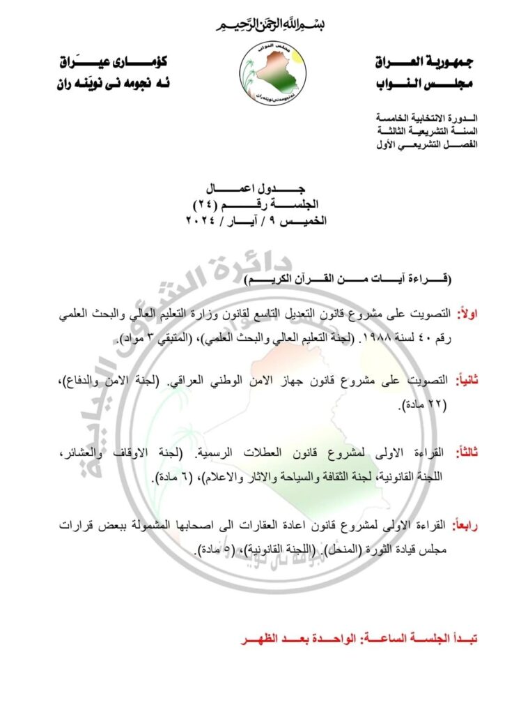 نشرت الدائرة الإعلامية لمجلس النواب، اليوم الثلاثاء، جدول اعمال جلسة البرلمان ليوم الخميس المقبل.