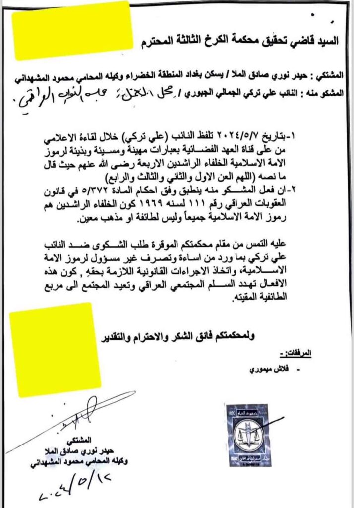 وأضاف أن “فعل المشكو منه ينطبق وفق أحكام المادة 372/5 من قانون العقوبات العراقي رقم 111 لسنة 1969 كون الخلفاء الراشدين هم رموز الأمة الإسلامية جميعاً وليس لطائفة أو مذهب معين”. وتابع الملا “وعليه نلتمس من مقام محكمتكم طلب الشكوى ضد النائب علي تركي فيما ورد من إساءة وتصرف غير مسؤول تجاه رموز الأمة الإسلامية واتخاذ الإجراءات القانونية اللازمة بحقه كون هذه الأفعال تهدد السلم المجتمعي العراقي وتعيد المجتمع إلى مربع الطائفية المقيتة”.