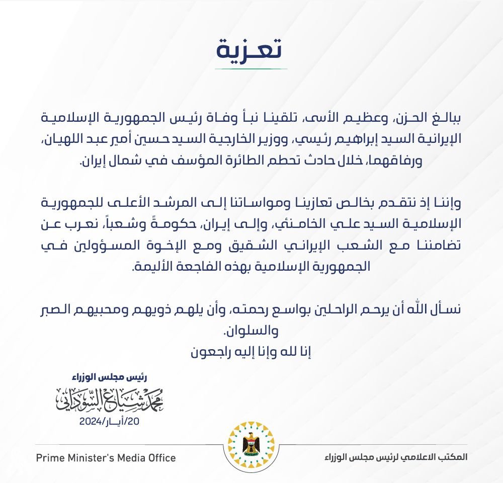 السوداني يعزي إيران حكومة وشعبا بوفاة رئيسي ومرافقيه