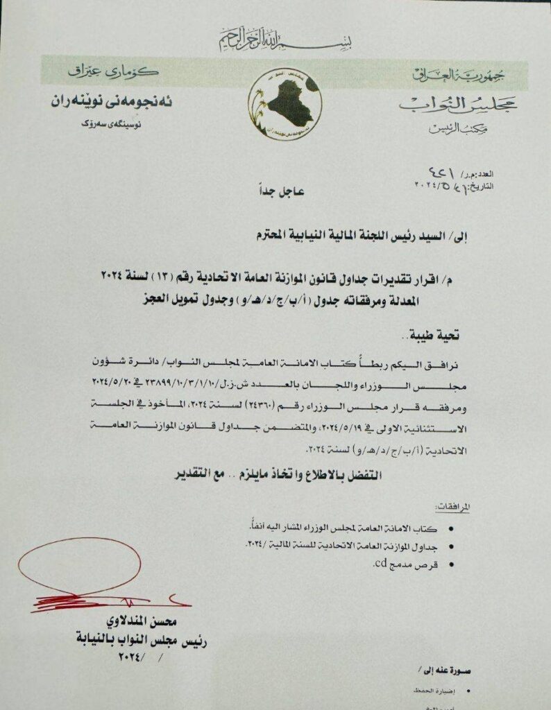 وبحسب وثيقة صادرة من المجلس بتاريخ الحادي والعشرين من شهر آيار الجاري وحصلت عليها “بغداد اليوم”، فأن “رئيس مجلس النواب بالنيابة محس المندلاوي اعلن إحالة جداول قانون الموازنة العامة الاتحادية 2024 إلى اللجنة المالية النيابية”.