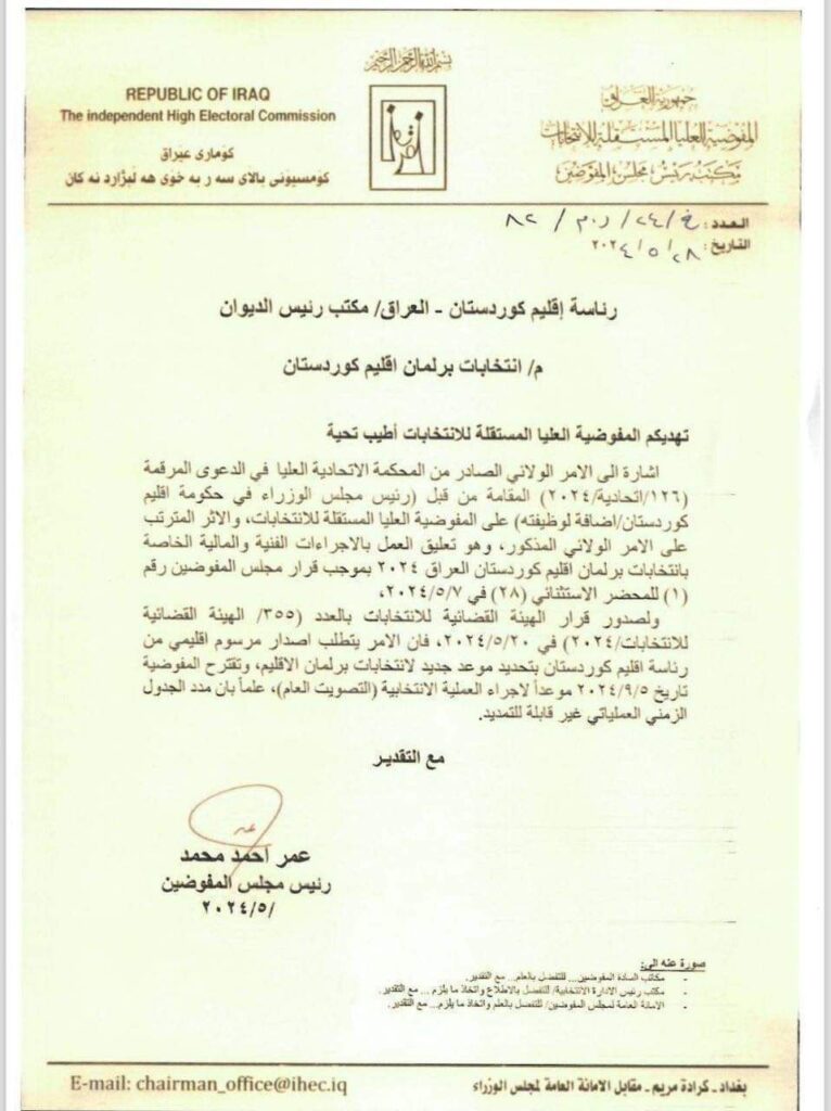 طلبت المفوضية العليا المستقلة للانتخابات في العراق، من رئاسة الإقليم المصادقة على إجراء الانتخابات البرلمانية بإقليم كردستان في الخامس من أيلول المقبل.
