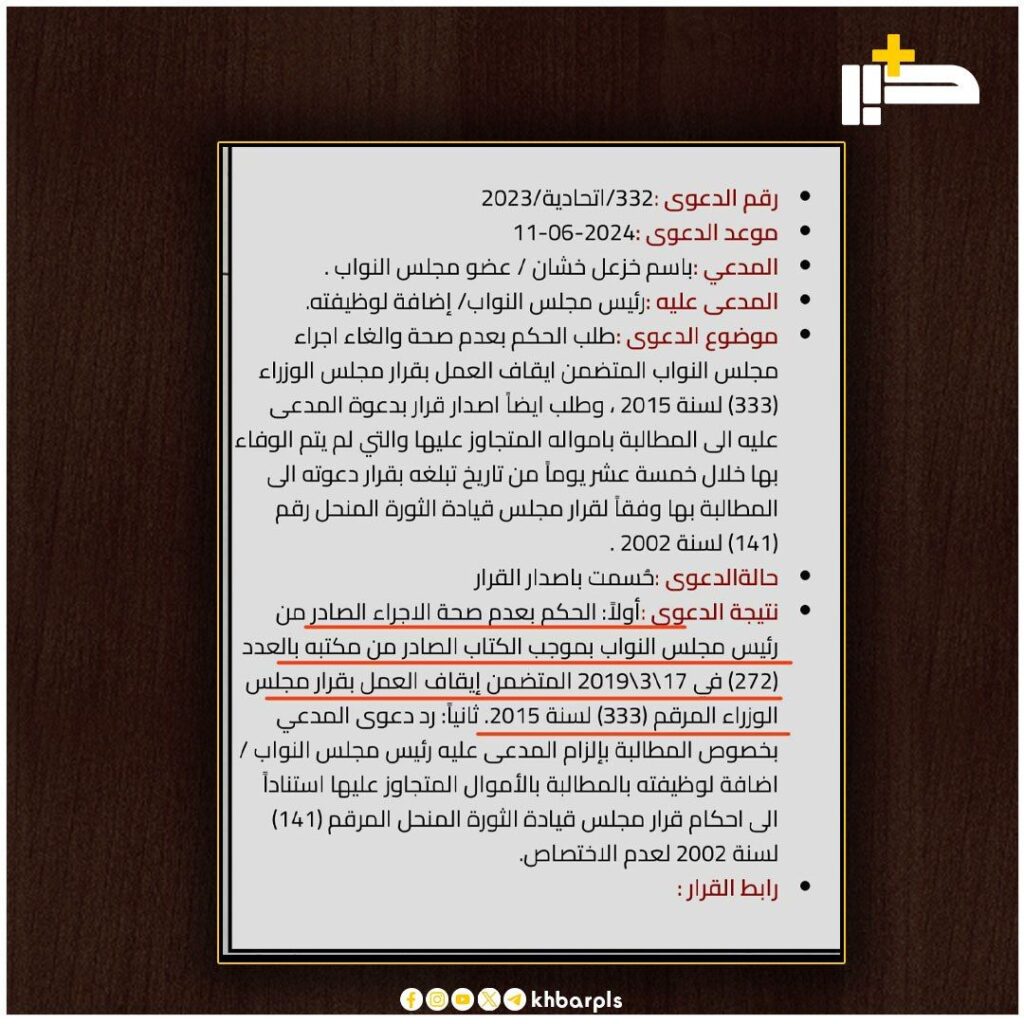 وذكر باسم الخشان عبر تدوينة على موقع “الفيس بوك” أطلعت عليها “منصة خبر”: أنه كسب دعوى مهمة أمام المحكمة الاتحادية العليا التي قضت بعدم صحة إيقاف مجلس النواب العمل بقرار مجلس الوزراء رقم 333 لسنة 2015 الذي تسبب إيقافه ضرراً جسيماً على أموال المجلس ومصالحه، وهذا القرار يمهد لمحاكمة السيد رئيس مجلس النواب السابق، محمد الحلبوسي، وفقا للمادة 340 من قانون العقوبات، لإحداثه ضررا عمديا بمصالح وأموال الجهة التي كان يعمل فيها (مجلس النواب)”.