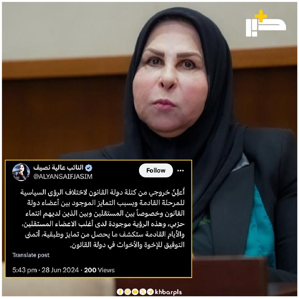 وذكرت نصيف بتغريدة لها عبر موقع “أكس”، أطلعت عليها “منصة خبر”: “أُعلِنُ خروجي من كتلة دولة القانون لاختلاف الرؤى السياسية للمرحلة القادمة وبسبب التمايز الموجود بين أعضاء دولة القانون وخصوصاً بين المستقلين وبين الذين لديهم انتماء حزبي”.