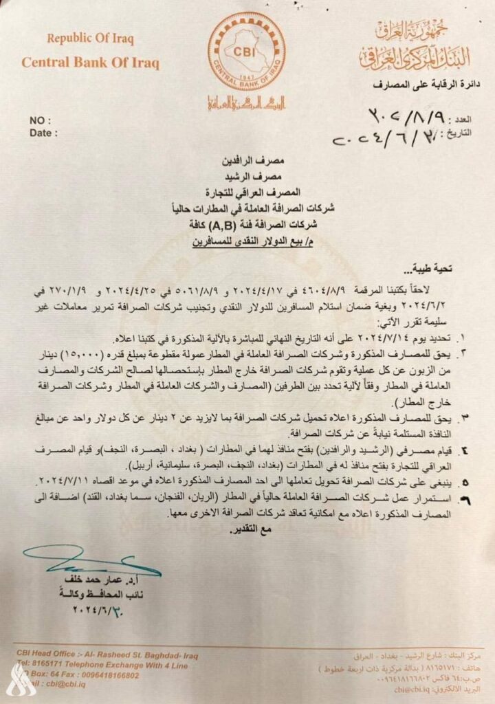 قرر البنك المركزي العراقي، منح الدولار للمسافرين في المطارات حصرًا ابتداءً من 14 تموز الجاري.