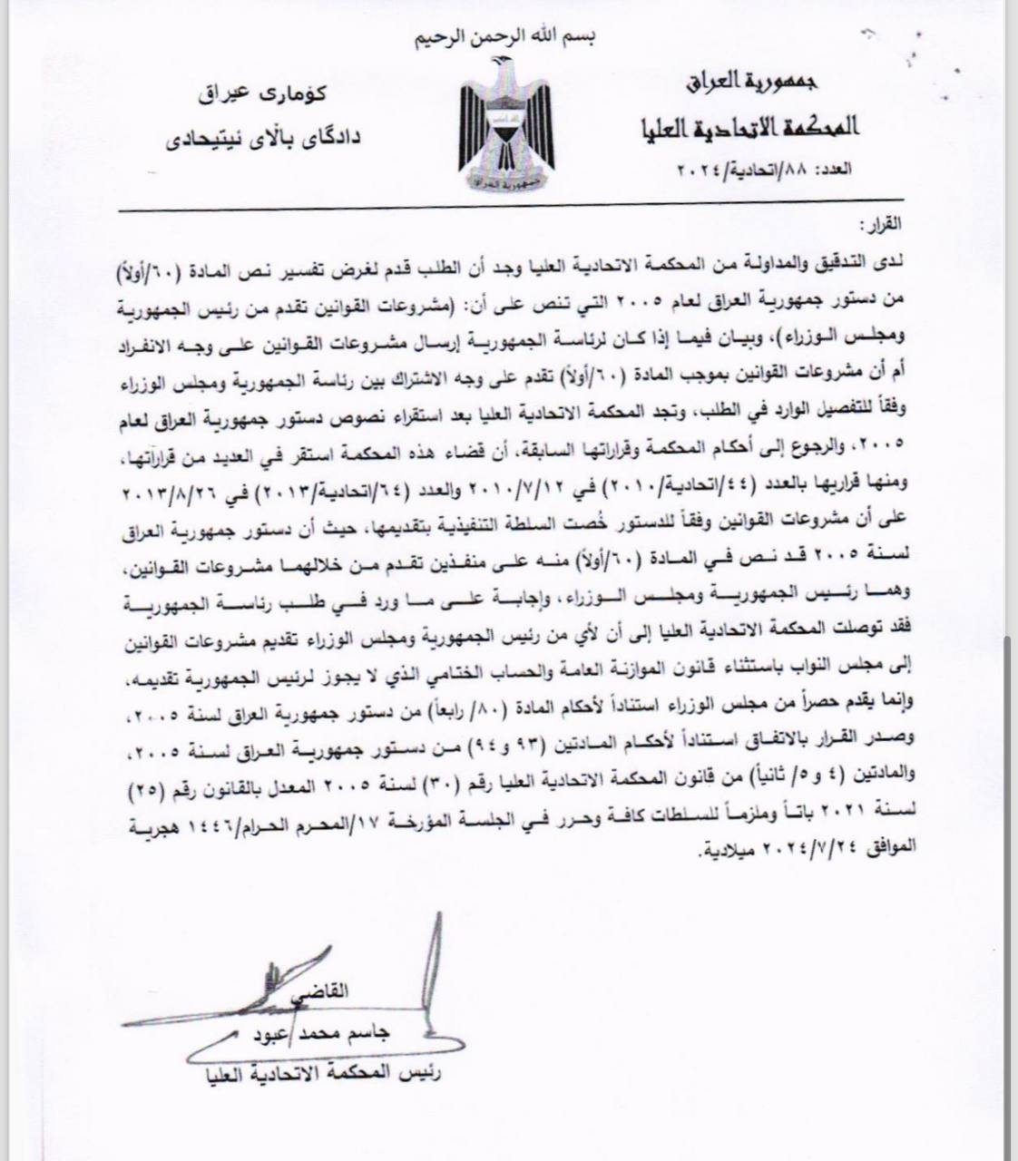 باستثناء الموازنة.. الاتحادية تحكم بصلاحيات الرئاسة في إرسال مشاريع القوانين للبرلمان