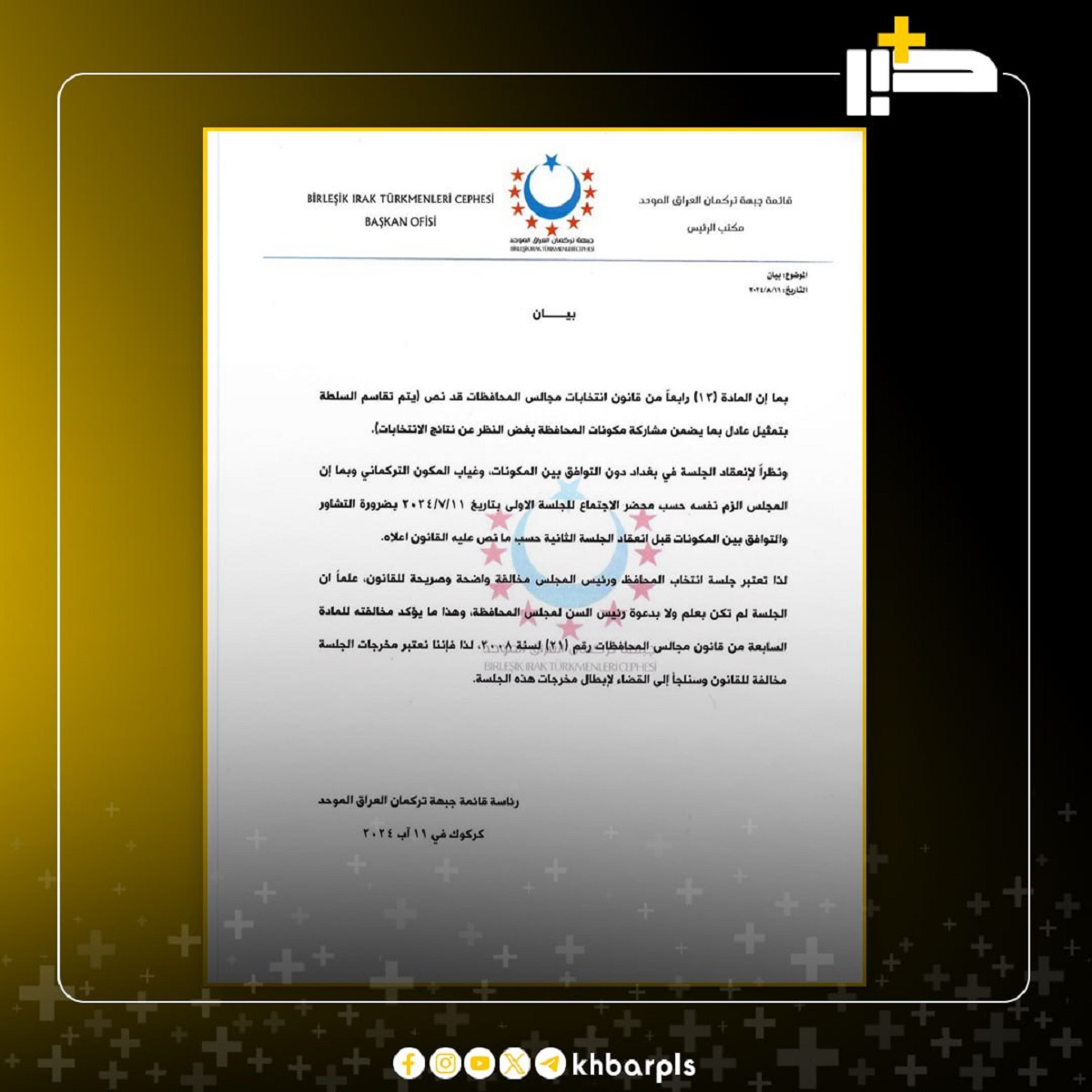 وذكرت رئاسة قائمة الجبهة تركمان العراق الموحد في بيان تلقته “منصة خبر”، بما إن المادة (۱۳) رابعاً من قانون انتخابات مجالس المحافظات قد نص (يتم تقاسم السلطة بتمثيل عادل بما يضمن مشاركة مكونات المحافظة بغض النظر عن نتائج الانتخابات).