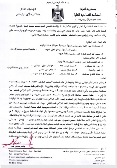 وبحسب وثيقة وردت لـ”منصة خبر”، فأن “المحكمة الاتحادية قررت انتفاء صفة الاستعجال وحالة الضرورة لإصدار أمر ولائي ضد إجراءات تشكيل الحكومة المحلية في كركوك، التي تمخض عنها اختيار المحافظ ريبوار طه، إلى جانب رئاسة وأعضاء المجلس”.