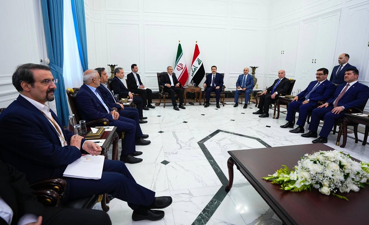وجدد السوداني، خلال اللقاء، بحسب البيان، “ترحيبه بالرئيس بزشكيان، في أول زيارة خارجية له بعد تسنّمه مهام منصبه”، مُستذكراً “مواقف الرئيس الراحل إبراهيم رئيسي تجاه العراق”، مؤكداً “أهمية العمل الثنائي بين البلدين لمواجهة التحديات الاقتصادية والأمنية في المنطقة، وبما يصب في مصلحة الاستقرار والتنمية”.