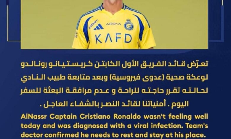 وذكر بيان للنادي تابعته “منصة خبر”، أن” قائد الفريق الأول كريستيانو رونالدو تعرض لوعكة صحية بسبب عدوى فيروسية، وبعد متابعة طبيب النادي لحالته تقرر حاجته للراحة وعدم مرافقة البعثة للسفر الى بغداد”.