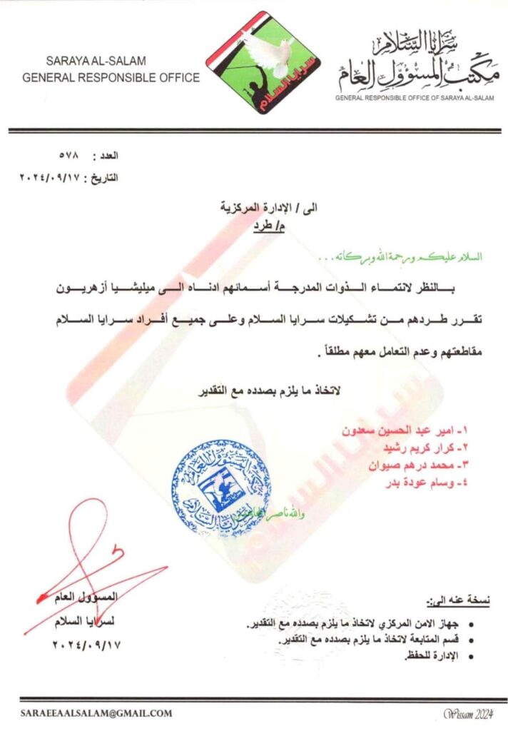 سرايا السلام تطرد 4 أفراد من تشكيلاتها لانتمائهم إلى مليشيات “الأزهريون”