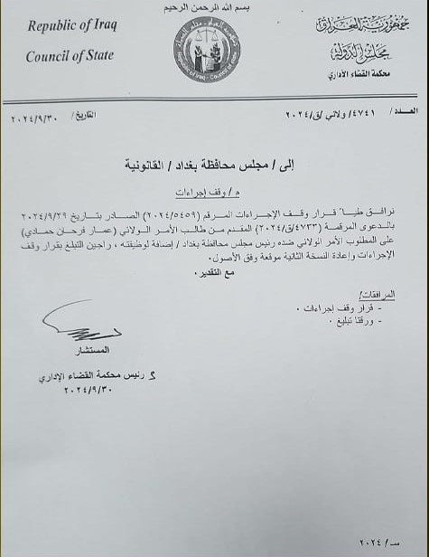 أوقف رئيس محكمة القضاء الإداري، اليوم الاثنين، اجراءات قرار رئيس مجلس محافظة بغداد عمار القيسي بما يخص فصل عمار الحمداني ويعده مخالفا.