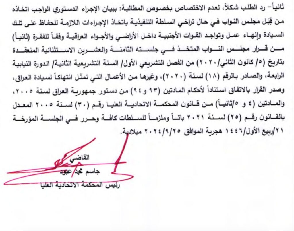 ردت المحكمة الاتحادية العليا، اليوم الثلاثاء، دعوى البرلمان على الحكومة بشأن اخراج قوات التحالف الدولي من العراق.