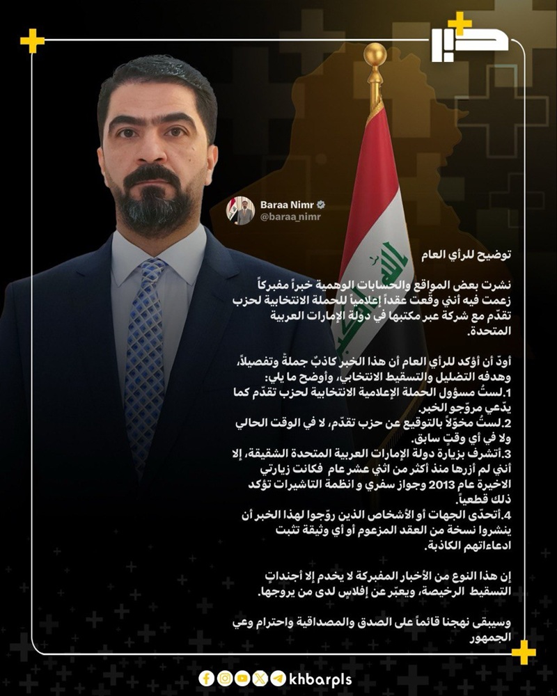‏أودّ أن أؤكد للرأي العام أن هذا الخبر كاذبٌ جملةً وتفصيلاً، وهدفه التضليل والتسقيط الانتخابي، وأوضح ما يلي: