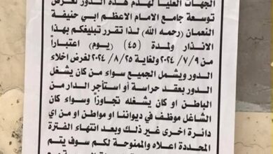 الوقف السني يمهل سكان منطقة الحارة في الأعظمية 45 يوما لإخلائها