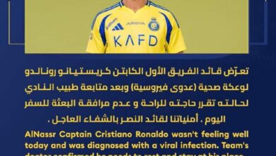 بسبب تعرضه لوعكة صحية.. رونالدو يغيب عن مباراة الشرطة والنصر